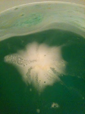 When you pop it in the bath, the first thing it does is fizz up and the white top goes soft like a melting marshmallow. It fizzes around for quite a while, leaving a trail of turquoise behind it. Then it burst open and 3 mini bath bombs came out that fizzed around and spread more colour, green blue and purple. Those fizz around for a while spreading colours until your bath is completely turquoise. Then you will start to notice little gold stars everywhere. Now these are particularly awesome because when I first saw these, I had visions of finding them all over myself and the bath for days to come. But the clever clogs at Lush had already thought of that. These starts very cleverly dissolve in the water, no cleaning required. You will also notice when you get in the water, only in the right light, you catch glimpses of glitter. Again, this is very clever, because it's not actual glitter that sticks to thing, your water simply...sparkles :) it's magical.